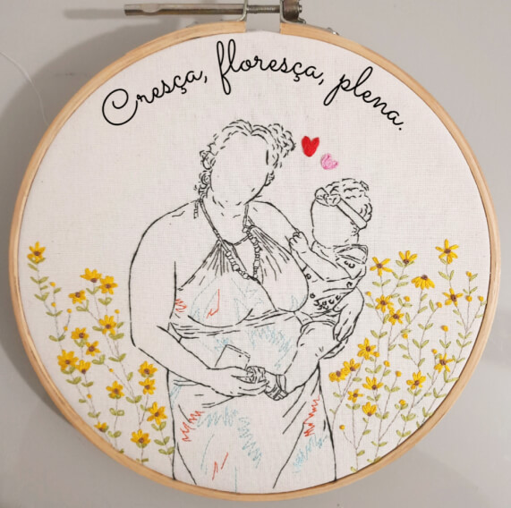 Porta maternidade, retrato bordado e presente afetivo